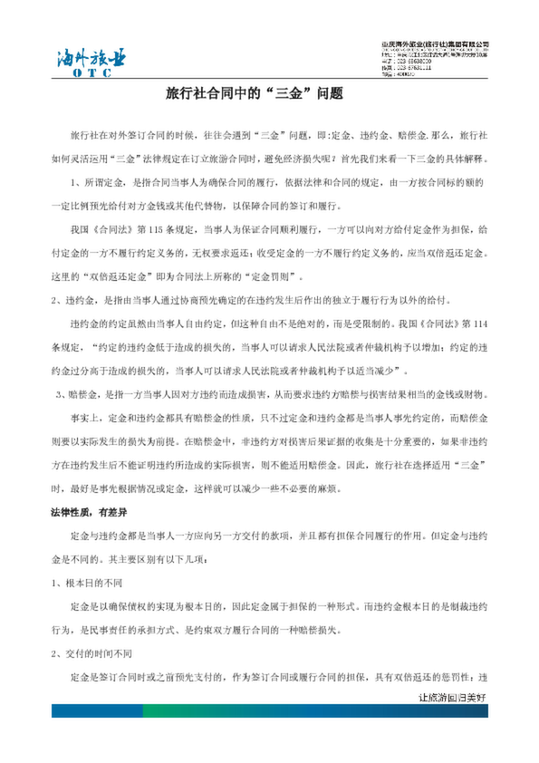 旅行社在對(duì)外簽訂合同的時(shí)候,往往會(huì)遇到“三金”問(wèn)題,即:定金、違約金、賠償金.那么,旅行社如何靈活運(yùn)用“三金”法律規(guī)定在訂立旅游合同時(shí),避免經(jīng)濟(jì)損失呢?首先我們來(lái)看一下三金的具體解釋。