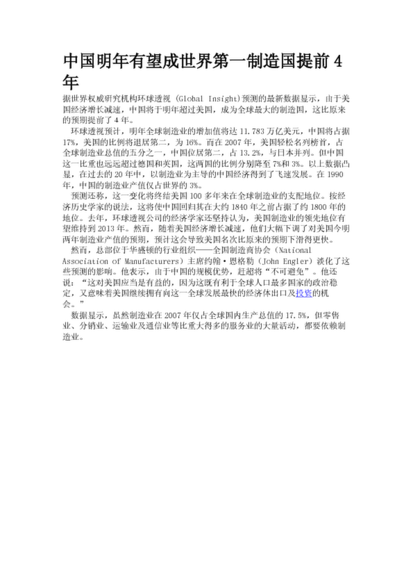 中國明年有望成世界第一制造國提前4年