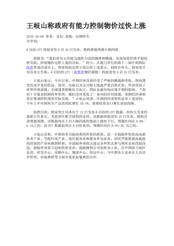 王岐山稱(chēng)政府有能力控制物價(jià)過(guò)快上漲