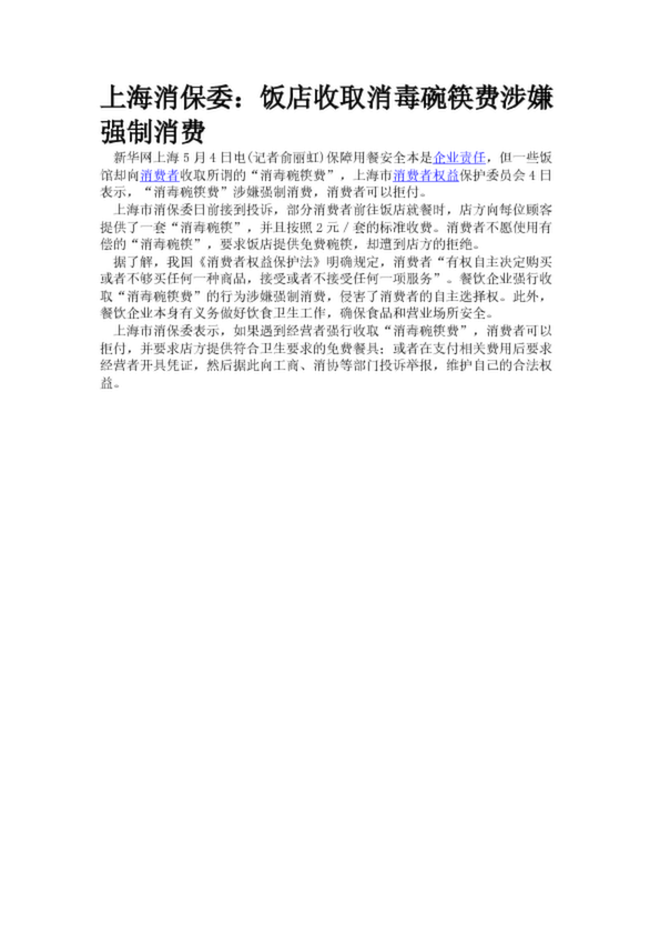 上海消保委:飯店收取消毒碗筷費(fèi)涉嫌強(qiáng)制消費(fèi)