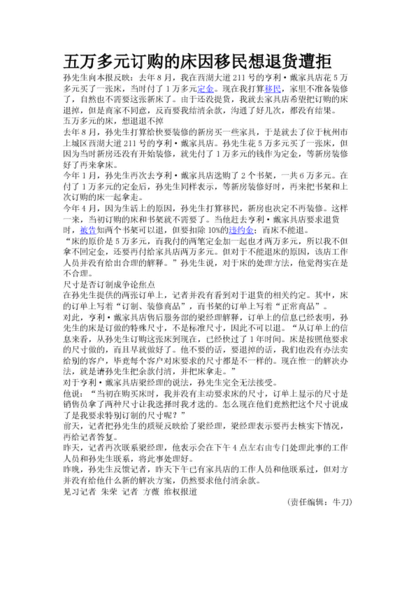 五萬多元訂購的床因移民想退貨遭拒