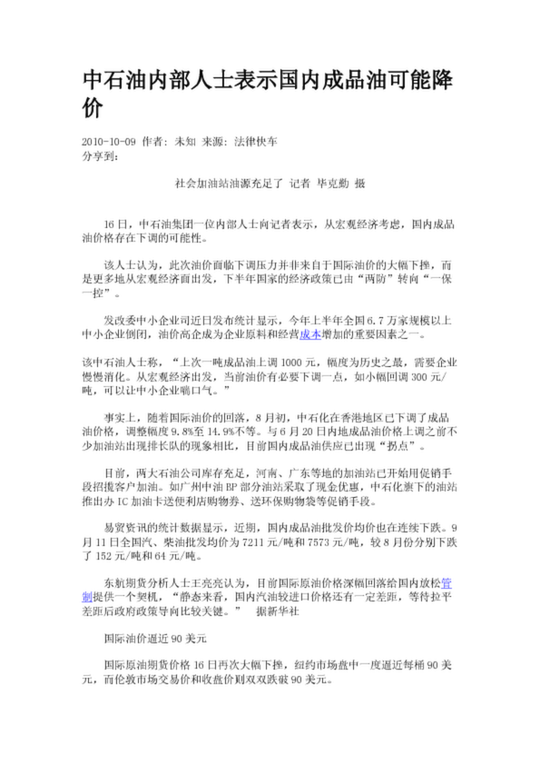中石油內(nèi)部人士表示國內(nèi)成品油可能降價(jià)