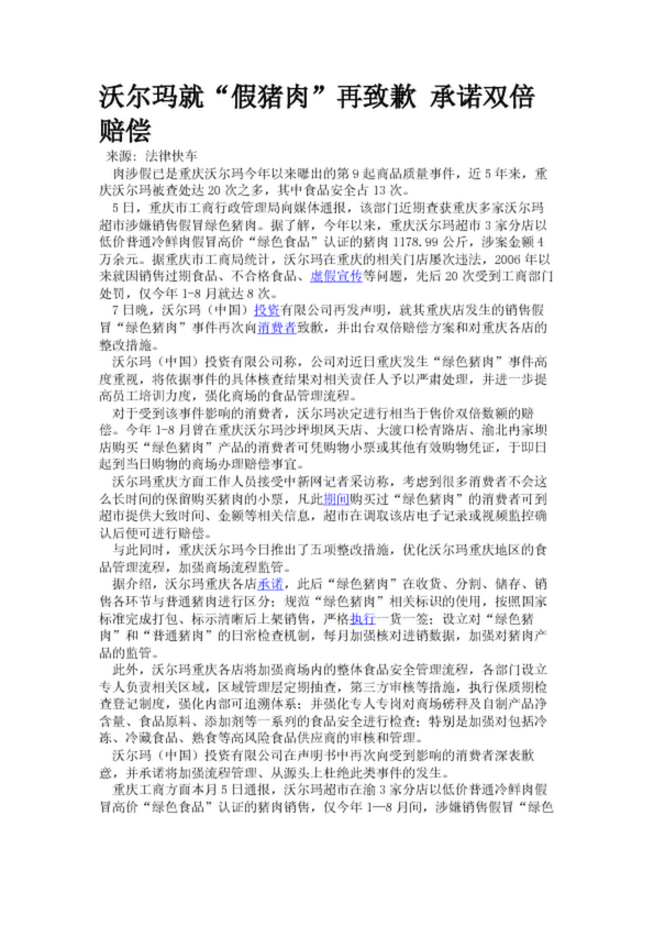 沃爾瑪就“假豬肉”再致歉 承諾雙倍賠償(27.69KB)