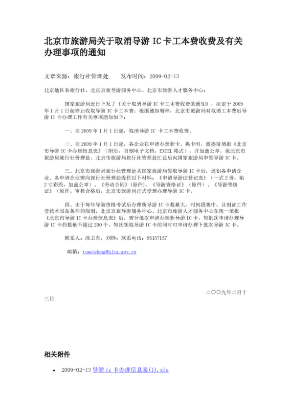 北京市旅游局關于取消導游IC卡工本費收費及有關辦理事項的通知(3.20KB)