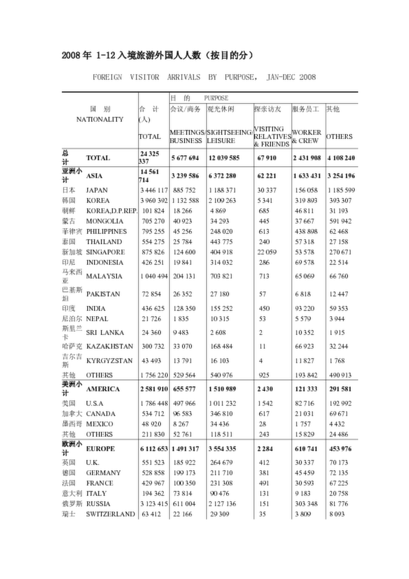 2008年 1-12入境旅游外國人人數(按目的分)的數據報告
