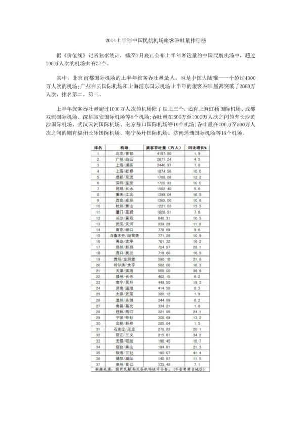 2014上半年中國民航機場旅客吞吐量排行榜(0.16MB)