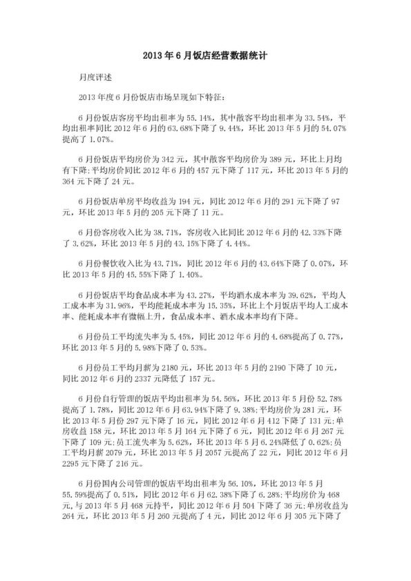 2013年6月飯店經營數據統計