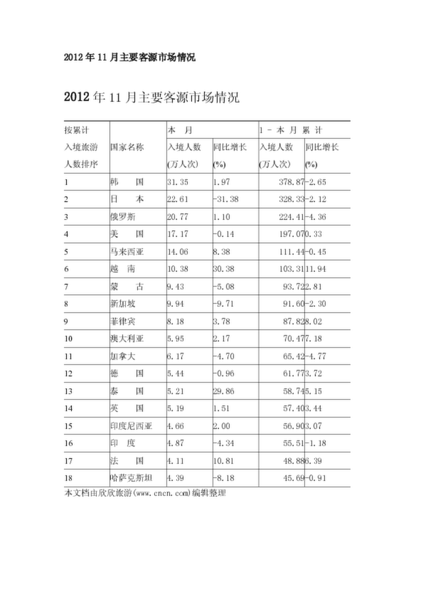 2012年11月主要客源市場情況