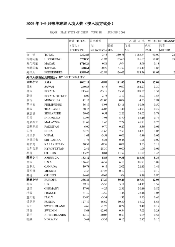 2009年1-9月來華旅游入境人數(按入境方式分)(0.12MB)