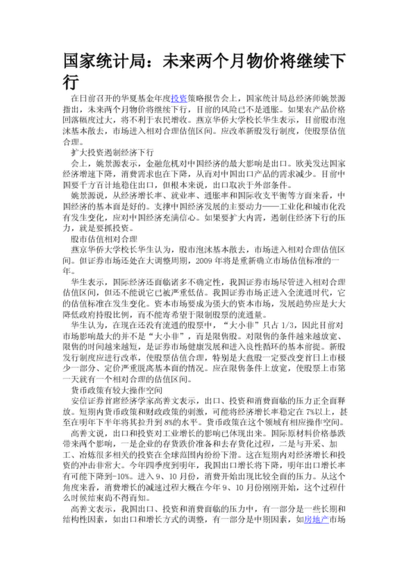 國家統計局:未來兩個月物價將繼續下行(20.68KB)